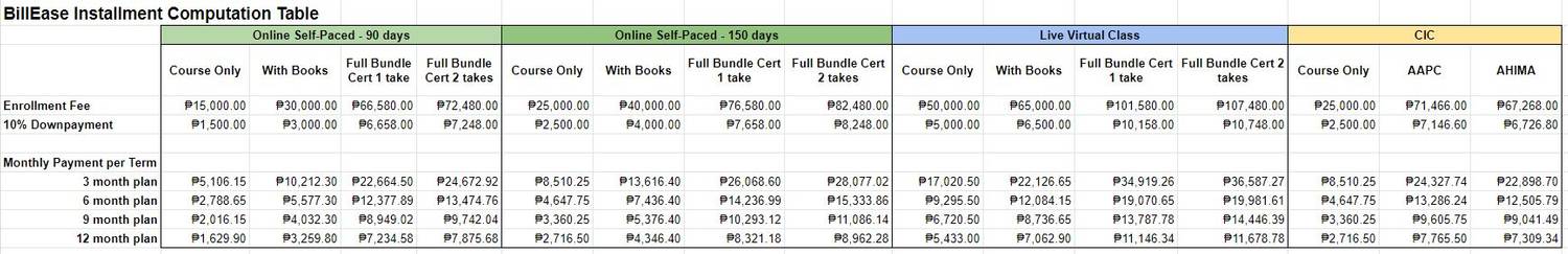 If the Medical Coding Full course bundle is Php 104,350.00, you will only need 2% or Php 2,087 available credit limit on your Billease account, to be able to transact.